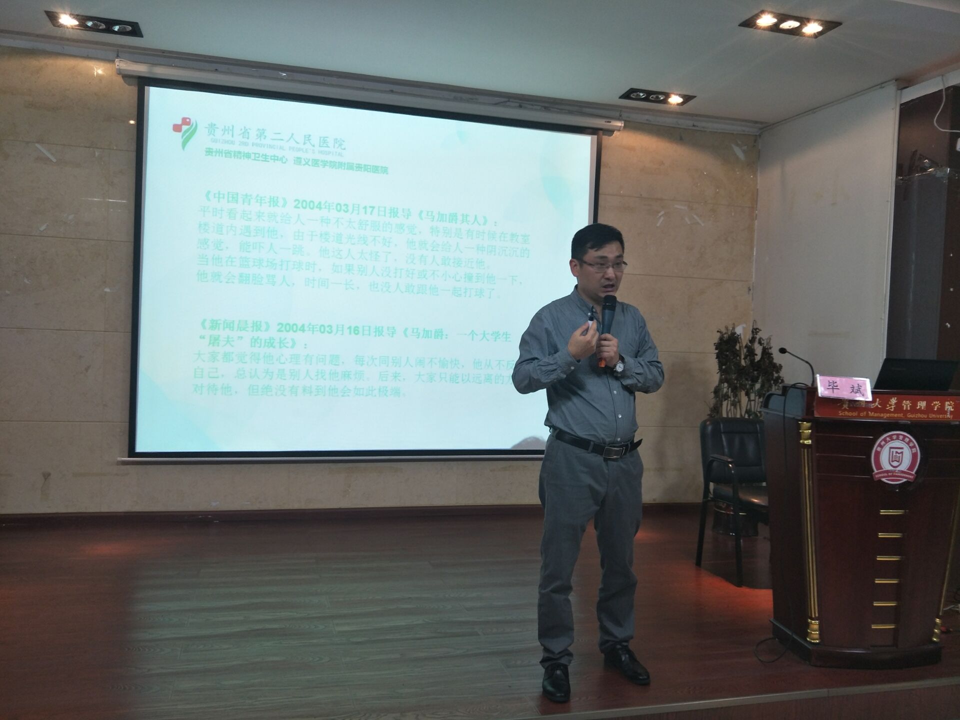 4月22日下午16:30,菠菜广告投放平台邀请了贵州省第二人民医院心身科主任、副主任医师毕斌老师在学院三楼报告厅为我院学生开展了主题为“青年期在校学生压力识别及应对策略”的讲座。管理学院学生科科长芮丽华老师出席此次讲座,学院各级同学参加本次讲座。