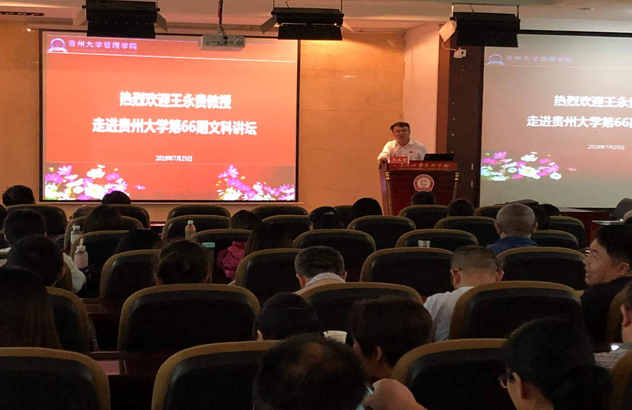 应管理学院邀请,首都经贸大学副校长王永贵教授于2019年7月25日上午10:00在管理学院三楼报告厅进行了题为“国家基金申报的经验与反思”的讲座。讲座由李烨院长主持,全体专职教师以及2017级和2018级全体研究生同学聆听。