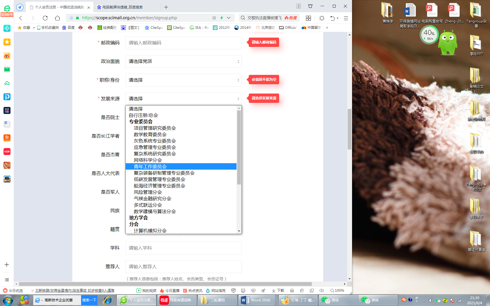 进入注册页面后,根据提示完善个人信息,其中发展来源列表中选倒数第三项“青年工作委员会”。