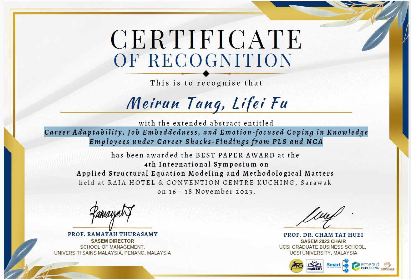 此次研讨会还邀请了Emerald出版社组织的编辑,讨论了如何在高水平期刊上发表论文;同时,来自全球各国的教授、学者和博士生们也纷纷汇报了自己近期的研究成果。可喜的是,汤美润老师及其研究生付礼菲(2022级工商管理专业)合作的论文“Career Adaptability, Job Embeddedness, and Emotion-focused Coping in Knowledge Employees under Career Shocks—Findings from PLS and NCA”深受评委会青睐,赢得了最佳论文奖项。此次成就标志着菠菜广告投放平台在国际学术界的影响力进一步提升,同时也为研究生培养提供了国际化的视野和实践平台。