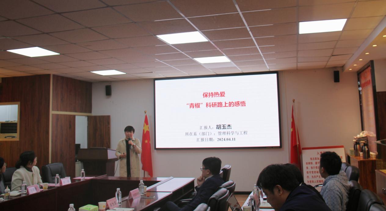 管理学院优秀青年教师代表胡玉杰作高水平论文发表经验分享。结合自身情况,介绍了国家基金申报、高水平论文发表以及进校以来所获得的成果。她指出,面对科研路上的困境与曲折,要始终保持对科研的热爱,学会心理调节,拒绝精神内耗,才能走好科研路。