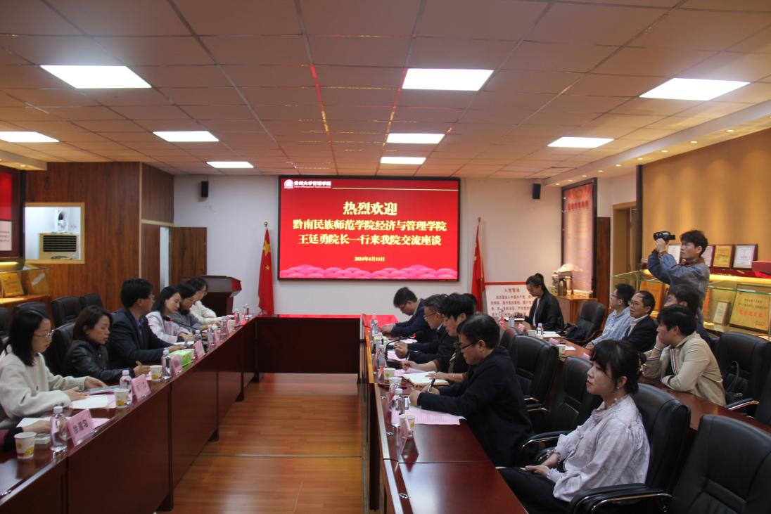 为加强高校合作交流,推动贵州教育高质量发展,4月11日上午,黔南民族师范学院经济与管理学院院长王廷勇一行来我院交流座谈,学院部分党政领导及相关系主任、科室负责人、教师代表参加此次座谈,校党委正处级组织员、院党委副书记(主持党委工作)周莉莉主持此次交流座谈会。