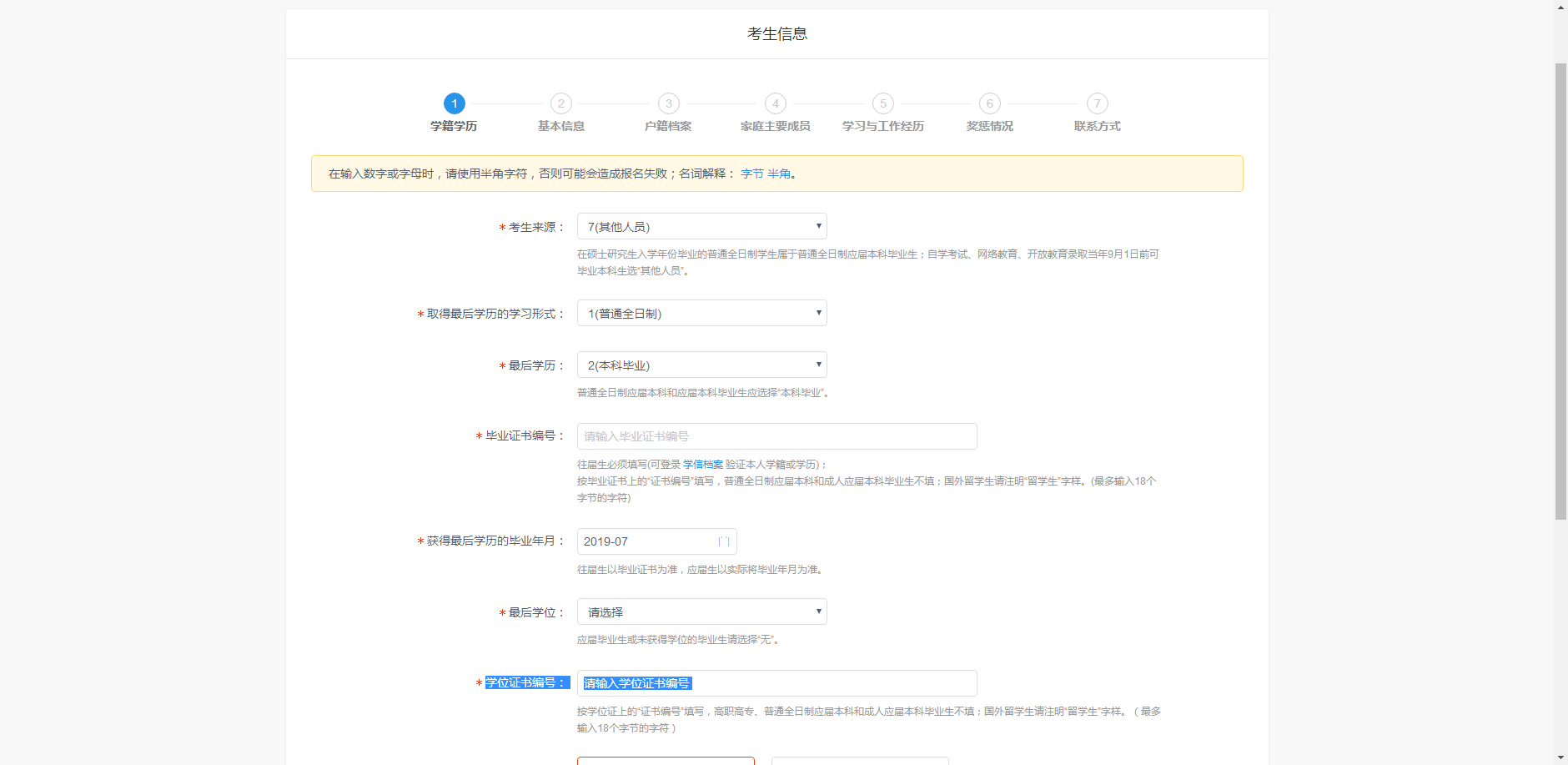 2. 顺次填写学籍学历→基本信息→户籍档案→家庭主要成员→学习与工作经历→奖惩情况→联系方式