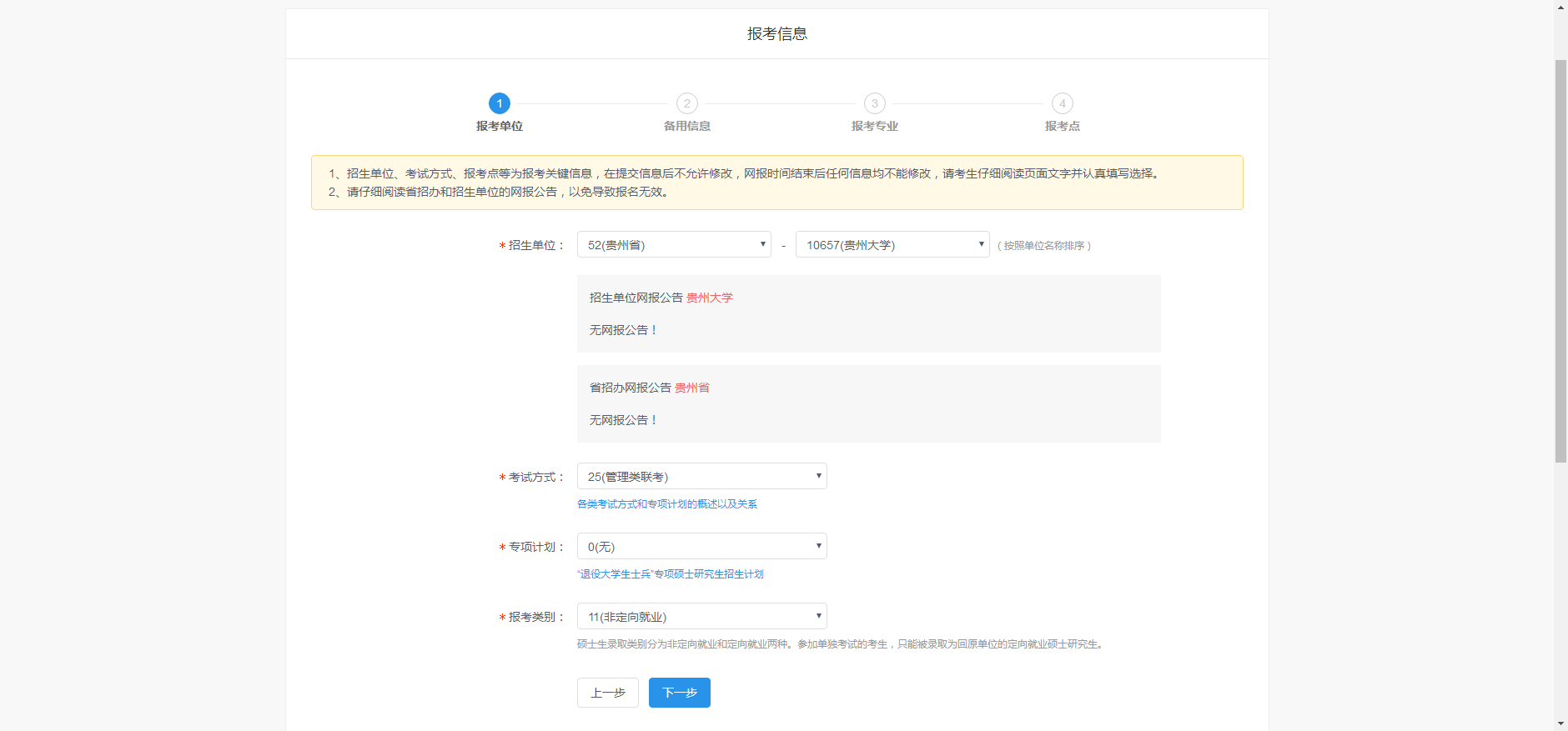注意:一个考生只能报考一所学校的一个专业,生成一条报名信息,填错的只能重新填写提交。